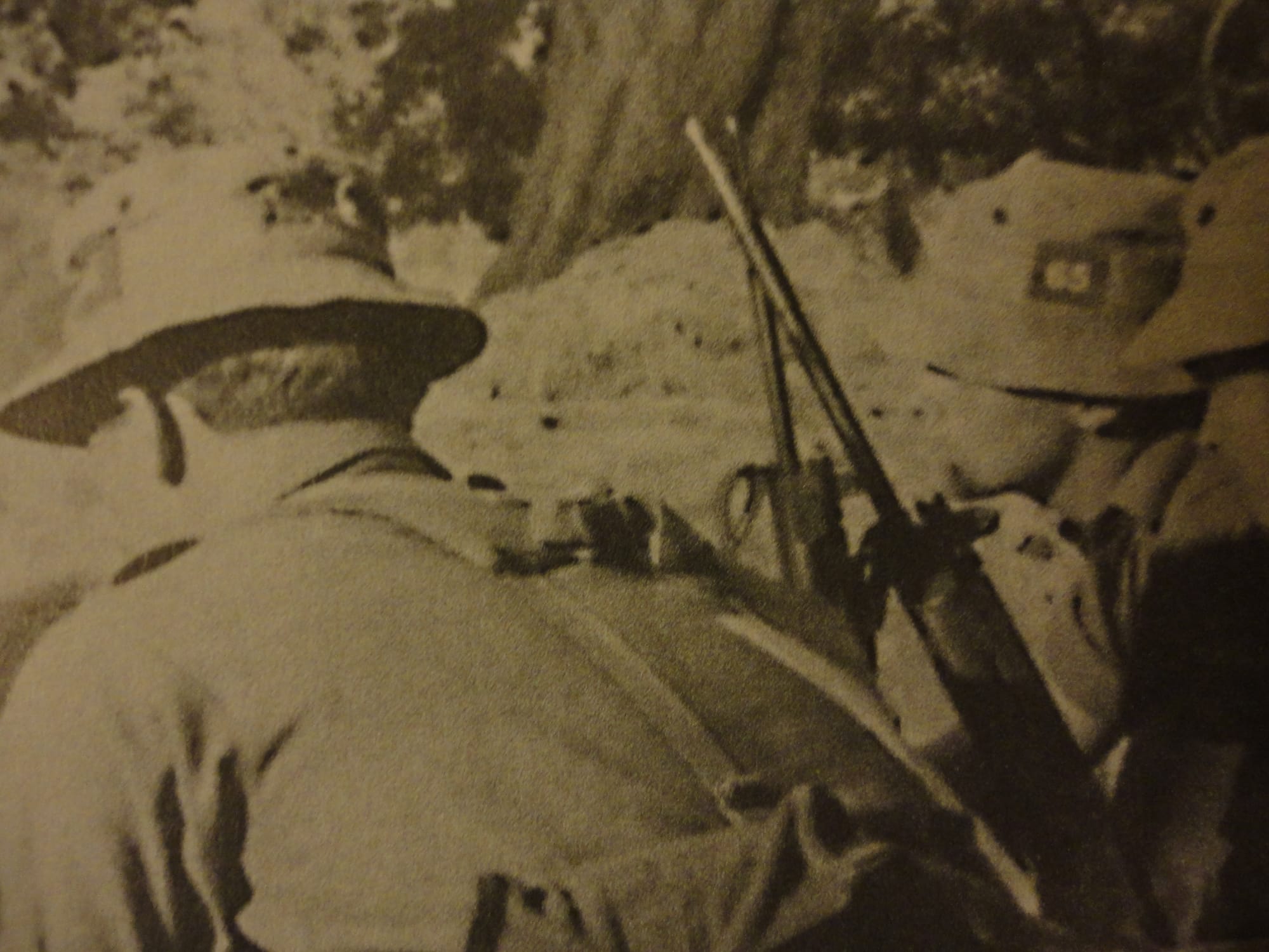 This photograph shows soldiers of the 1st Battalion in Cyprus in 1967 (just prior to disbandment). They wear the olive green bush or jungle hat with a battalion patch sewn into the left hand side. The patch was a red square with the number 65 embroidered in white.