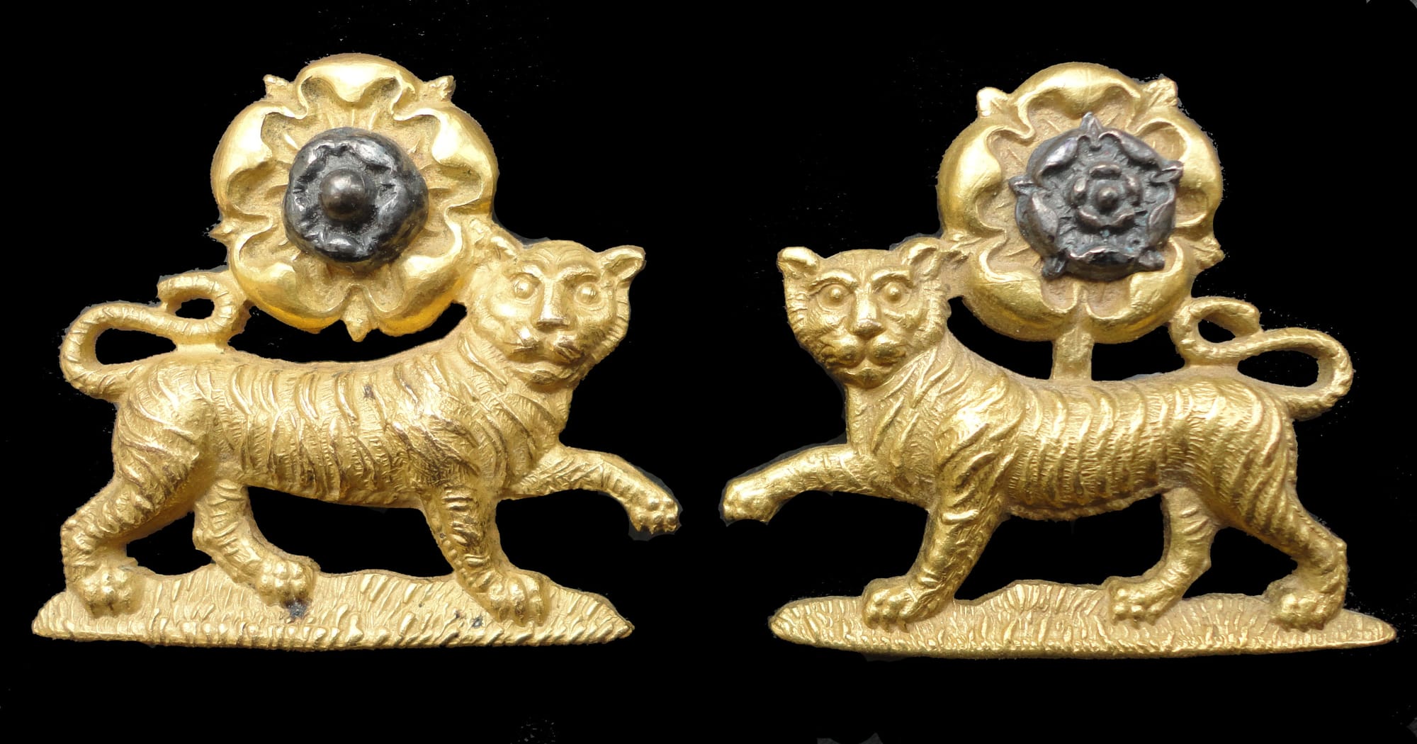 This collar badge with the Royal Tiger and Union Rose is made in gilt metal, and has a silver centre to the Rose which is pinned to the rear of the Rose.