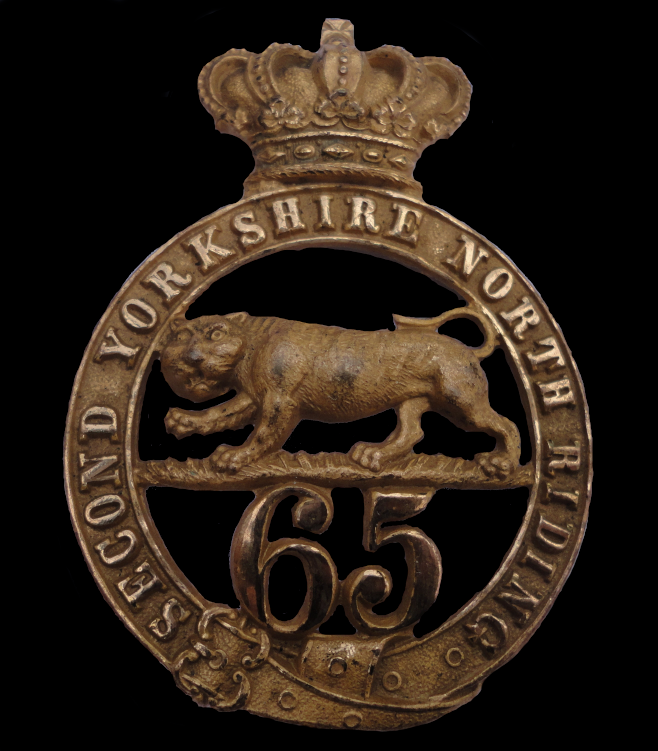 This is a rare example of an officers pre territorial glengarry badge. It differs from the OR's badge in that instead of being brass, it is made of fine quality fire gilt. The badge has a strap with the words ‘Second Yorkshire North Riding’ surmounted by a crown. In the centre of the strap is the Royal Tiger standing on ground above the number 65.