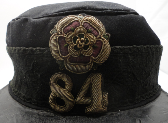 84th of Foot 1857 pattern Officer’s Forage Cap. The cap has a blue cloth body with a black acorn lace welt. The embroidered badge displays the Union Rose in gold lace with dark red central panels and green silk outer petals with the number 84 below in gold lace.
