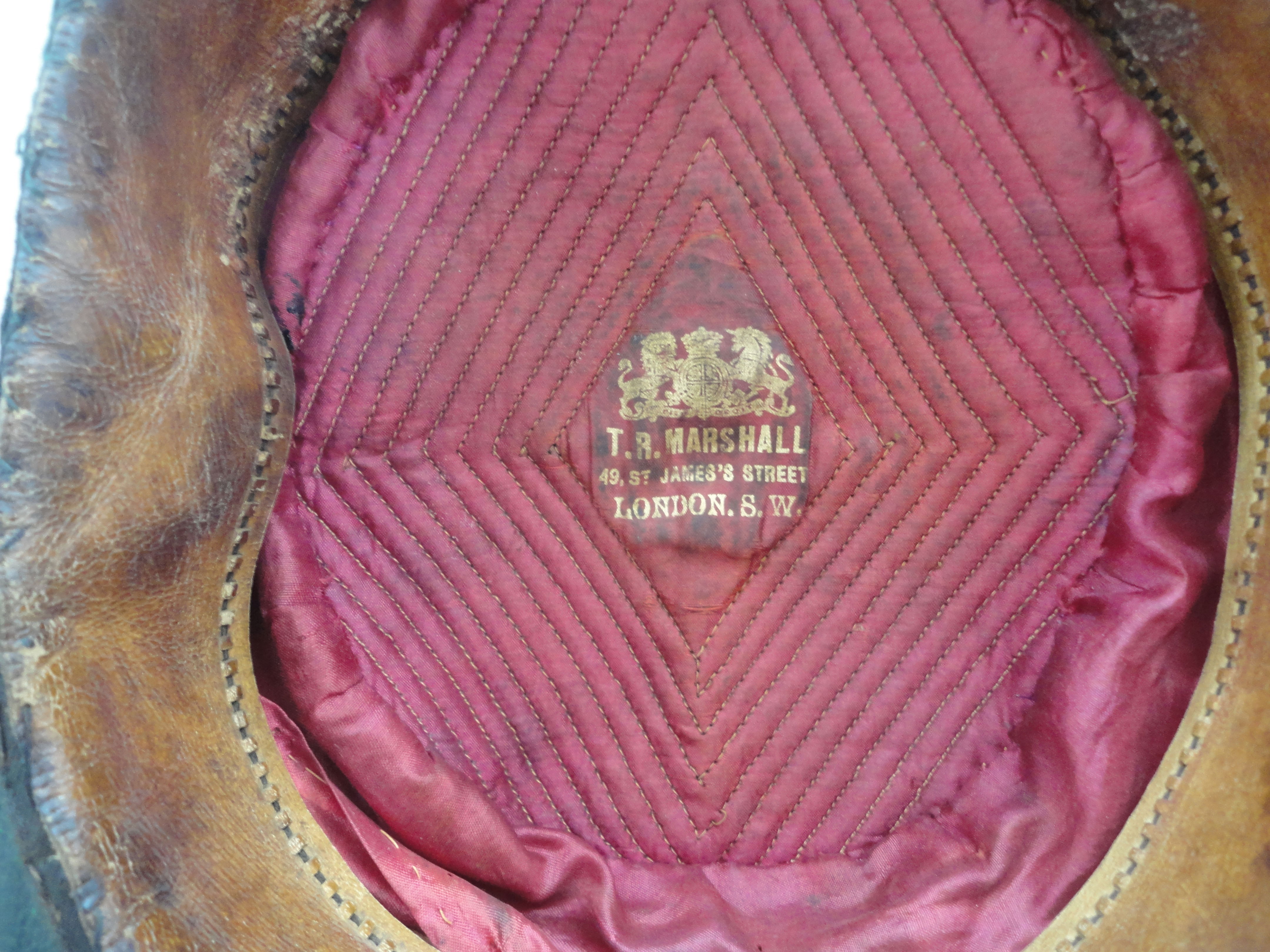 The lining is quilted red silk with a leather sweatband with the makers mark T.R. Marshall of St James's Street, London. This is a rare cap.