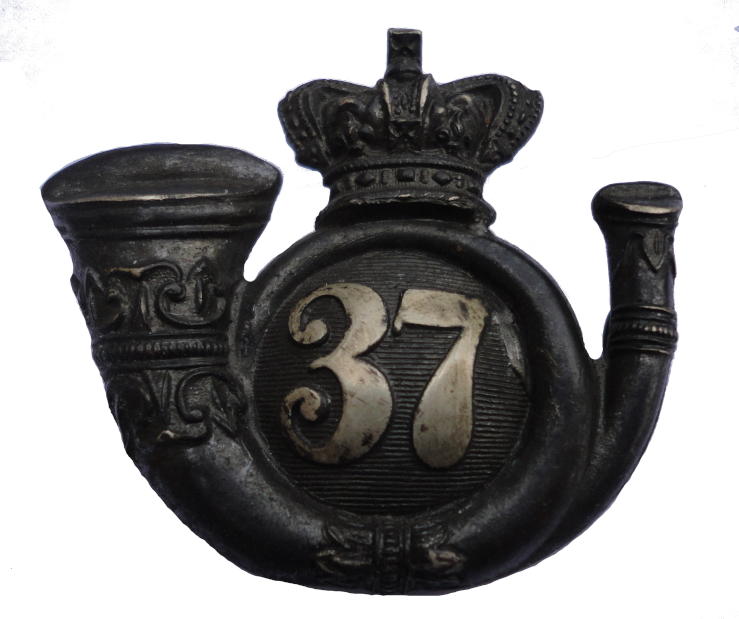 Badges to units such as the Rifle Volunteer Corps are rare but a Glengarry badge is known. This example is a die stamped, coiled bugle surmounted with a crown in blackened white metal with the number 37 highlighted within the bugle.